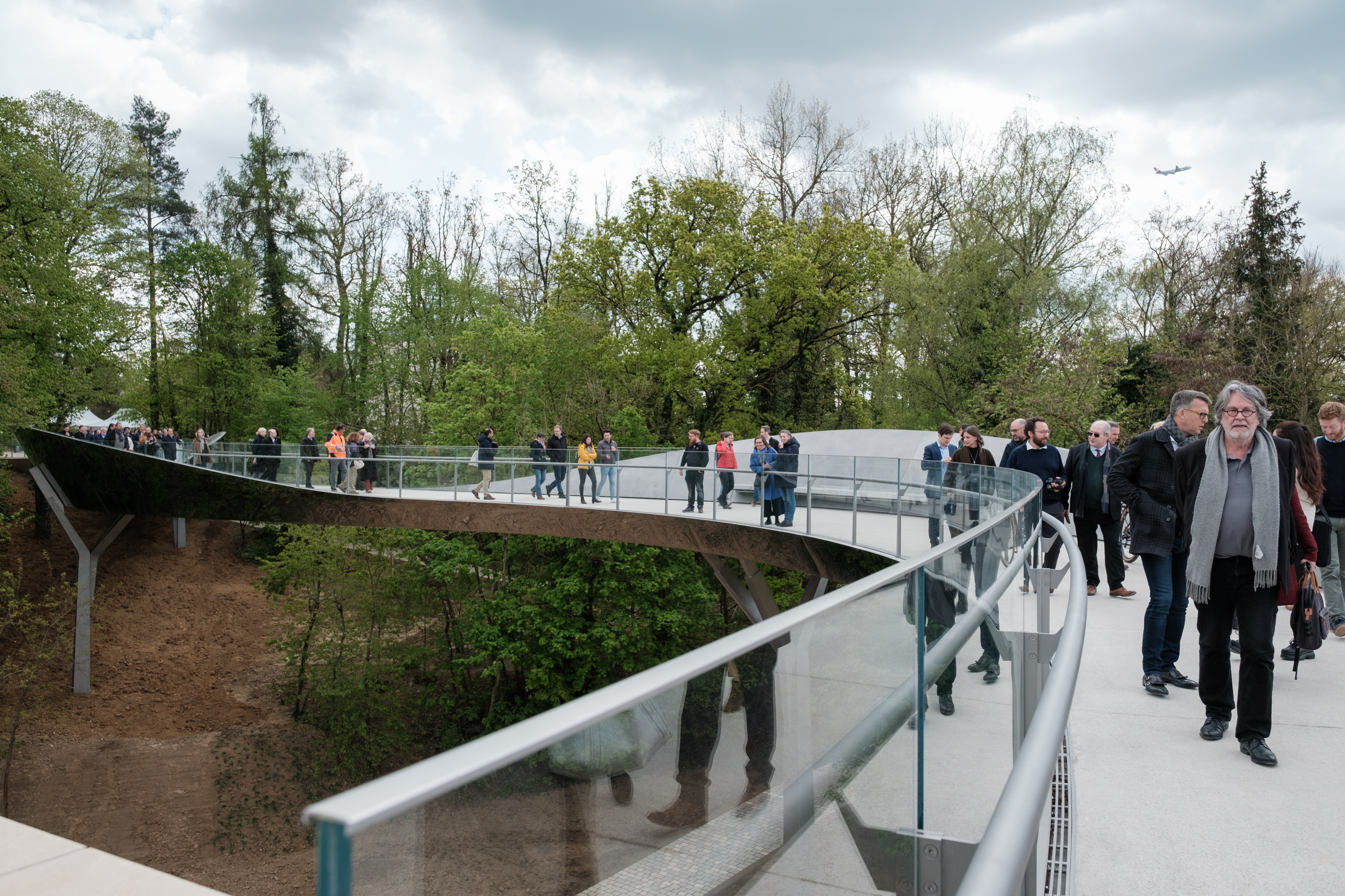 Cette nouvelle passerelle piétonne et cyclable traverse la forêt domaniale des Trois Glands. D’une longueur totale de 87 mètres et surélevée à 12 mètres, elle dessine une courbe en S filigrane. La passerelle s’intègre harmonieusement dans le paysage boisé traversant la forêt domaniale des Trois Glands pour relier l'aménagement urbain contemporain du plateau de Kirchberg, notamment le pôle d'échange Rout Bréck-Pafendall, le Musée d'Art Moderne Grand-Duc Jean (MUDAM) ainsi que le Musée Dräi Eechelen. L’objectif de cette structure est aussi d'accroître la visibilité et la fréquentation du site.