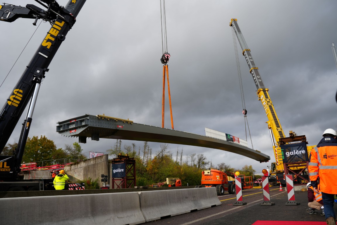 Au matin du 25 octobre 2025, l’ancien ouvrage est d’abord démoli. La nouvelle passerelle est mise en place par deux grues mobiles de 750 tonnes. Elle assure le franchissement sécurisé de l’A3 pour les piéton*nes et les cyclistes. Il s’agit d’un ouvrage métallique de type caisson creux, soudé et étanche à l’air. La portée entre les culées est de 60 mètres, avec une largeur de tablier de 3 mètres. L’ensemble pèse environ 90 tonnes.