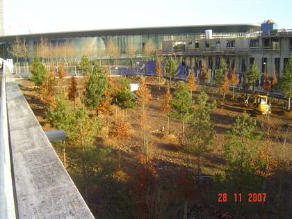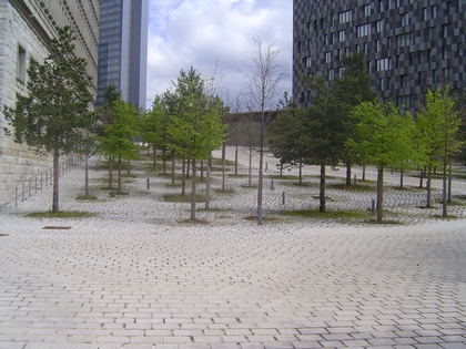 Les arbres seront plantés de façon à créer une place semi-urbaine à caractère naturaliste qui garantira une transparence entre la Place de l'Europe et le Musée d'Art moderne. Une dominante de pins constituera l'ambiance végétale.