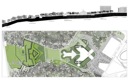 Le plateau même sera un vide, une clairière naturaliste aux bords boisés, afin de ne pas altérer la lisibilité du paysage, vu depuis la vielle ville.