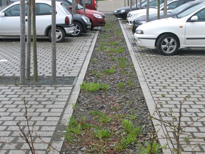 Les séparations entre les places de parking sont marquées par des arbustes ou des arbres qui offrent de l’ombrage. L’impact du soleil et de la pluie est réduit par les voitures en stationnement, ce qui endigue également la croissance de la végétation de façon naturelle.