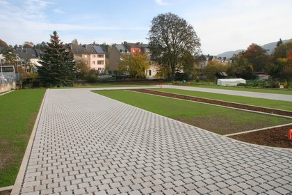 L’attention est portée pour éviter de sceller les surfaces de stationnement et de permettre à l’eau pluviale de s’écouler à travers le revêtement. Seules les voies carrossables sont consolidées et imperméables.