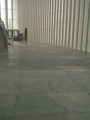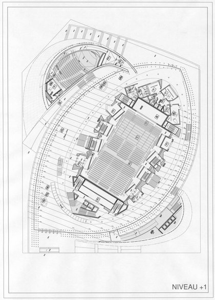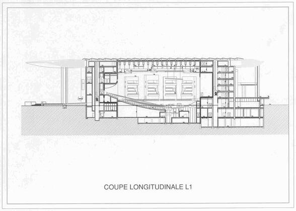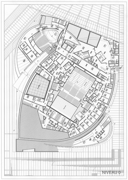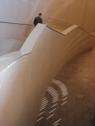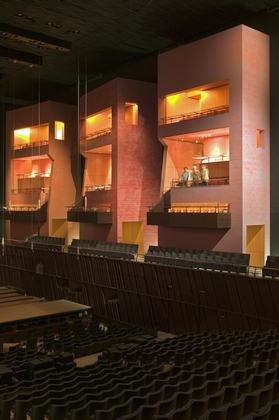 Entre le filtre de colonnes extérieur et le noyau central, un vaste hall enveloppe entièrement le grand auditorium. Des rampes, escaliers et passerelles mènent à la salle, la contournent et la relient aux loges. On retrouve ici ce mouvement ascendant et descendant, communiquant avec le bâtiment et invitant le visiteur à rester, à découvrir, à se promener, à regarder et à être vu. Le mélomane traverse ce grand hall à la découverte d'un autre monde, celui de la musique.