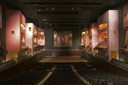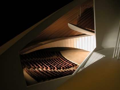 Comme un bâtiment dans le bâtiment, le grand auditorium est entouré d'une rampe et de passerelles donnant accès aux loges. Sa façade en forme de falaise prismatique résulte des formes irrégulières et verticales de la partie arrière des tours de loges qui traverse les murs du grand auditorium. Ceux-ci absorbent la lumière à travers la toiture vitrée. La nuit, un concept lumineux sophistiqué fait rayonner les falaises, et crée ainsi une réelle relation optique entre l'intérieur et l'extérieur.