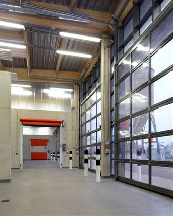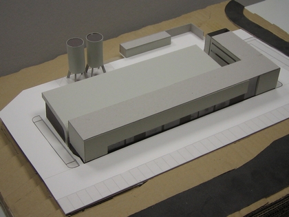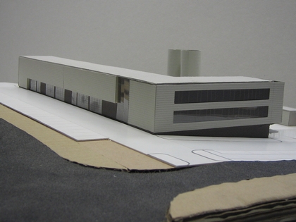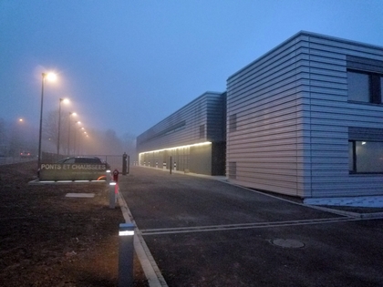 Les deux bâtiments longeant les voies publiques et formant une situation d'un angle urbain signalisent l'entrée à la zone d'activité en général et l’accès public au site des Ponts et Chaussées en particulier.