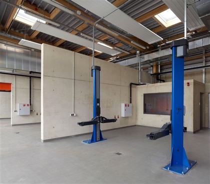 Le hall des ateliers et des garages par contre est conçu comme construction légère, dont la structure portante est composée de poutres en bois lamellé collé reposant sur des piliers en béton.
