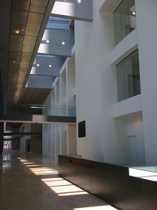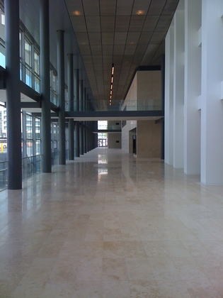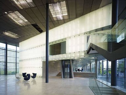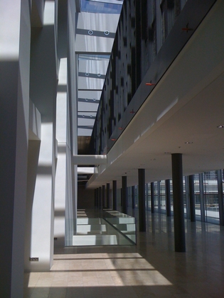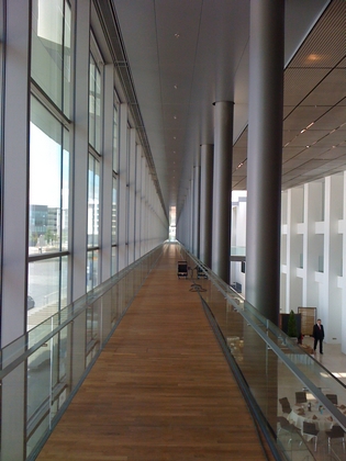 La façade du grand foyer est une grande surface vitrée d’une hauteur moyenne de 12 mètres sur une longueur totale d’environ 300 mètres formée de volumes à trame horizontale de 3,5 mètres fois 1,6 mètres. Le vitrage est isolant et multicouches garantissant une valeur thermique conforme aux exigences réglementaires en matière d’environnement.