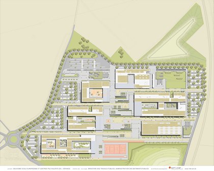 L’Ecole européenne et le Centre Polyvalent de l’Enfance sont implantés entre les agglomérations de Bertrange et Mamer à flanc de colline dans un contexte défini principalement par la nature mais aussi par les éléments construits qui y sont implantés tels le Lycée technique Josy Barthel, la ligne de chemin de fer et la route nationale N6. Le paysage fournit le contexte déterminant du projet avec la douce pente du terrain exposé vers l’ouest et une végétation typique pour les zones agricoles du bon pays. Le projet prévoit d’intégrer de façon sensible le complexe scolaire dans cet environnement unique qui sera métamorphosé en un parc recueillant des bâtiments de faible hauteur. Cette intégration requiert la fragmentation du volume bâti en une suite de six bâtiments isolés selon les exigences fonctionnelles du programme. Par la disposition en escalier des immeubles qui suit au plus près la dénivellation du terrain naturel, l’impact visuel du construit sur le naturel est maîtrisé.