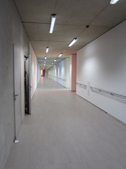 Vers l’extérieur le front des bâtiments délimite clairement la zone scolaire intérieure destinée aux élèves et leurs enseignants. Les voies parallèles qui le percent, les acheminent vers le centre du complexe scolaire. Ces voies sont utilisées au même titre par les services d’entretien et de secours.