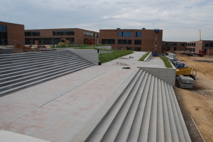 Le terrain présente un dénivelé d’environ 13m mis à profit d’un concept en plateaux, supports des bâtiments. La différence de niveau entre plateaux assure la séparation entre les cours de récréation des écoles.