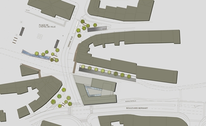Le bâtiment est implanté à la limite sud du nouveau boulevard Berwart et à l’ouest attenant à la rue de l’Alzette et à la place de l’Hôtel de Ville.