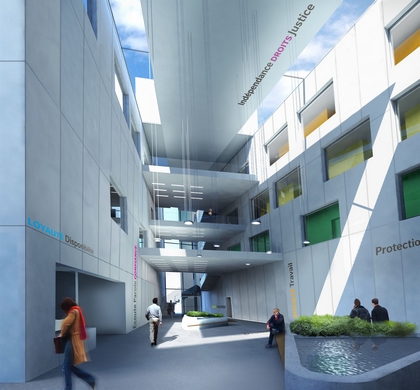 Les couloirs donnant sur l’atrium seront de couleurs différentes, ce qui engendre un jeu de couleurs et de tons alternant et changeant entre les couloirs et les deux ailes administratives.
