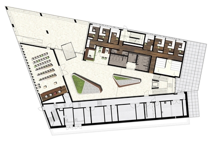 La structure interne du bâtiment se divise en parties publiques, semi-publiques et zones réservées au personnel de la justice.