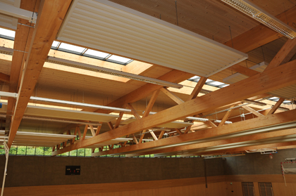 Le langage architectural est clair et structuré et la gamme de matériaux très réduite. L’apparente austérité des sols et des murs en béton apparent brut contraste avec la chaleur du bois de sapin de la charpente, des plafonds et des habillages muraux. Les installations techniques apparentes sont parfaitement ordonnées et se démarquent par leur couleur blanche uniforme. Grâce à cette rigueur qui se décline à travers tout le bâtiment, le hall sportif dégage une certaine harmonie et sérénité.