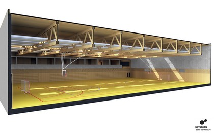 Le bâtiment abrite une salle de sports de 29 mètres par 47 mètres qui peut être divisée par deux rideaux mobiles. L’éclairage naturel diffus de la salle est assuré par deux bandeaux de verrières complétés par une rangée de fenêtres orientées au nord, ce qui réduit considérablement les besoins en éclairage artificiel. Les locaux annexes sont répartis sur deux niveaux adossés à la salle.