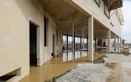 - la zone «Magasin – Acropolis» à l’extrémité nord-ouest comprend cinq niveaux de stockage où sont entreposés les collections et fonds patrimoniaux de la Bibliothèque nationale du Luxembourg au-dessus desquelles se situe au niveau +3 la salle de lecture principale. Elle s’ouvre de manière généreuse sur les couronnes d’arbres du Parc Grunewald. Le volume de « l’Acropolis » est habillé à sa périphérie d’une structure brute en gabions, éléments identiques à la bordure paysagère et aux colonnades.