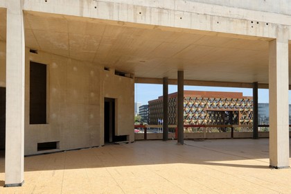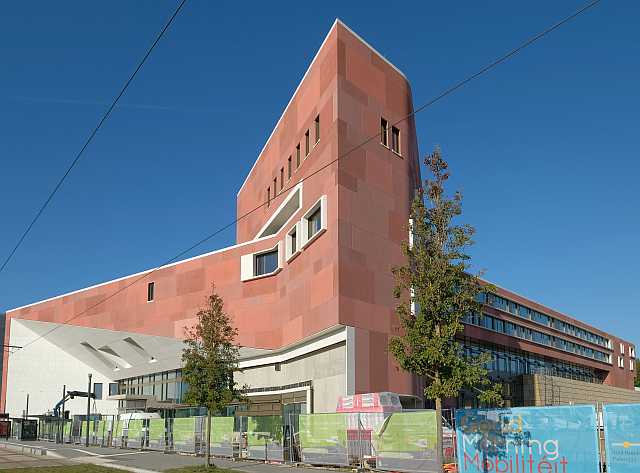 La structure monolithique du bâtiment de la Bibliothèque est marquée en façade extérieure par des éléments de grand format, en béton vu teintés de couleur rouge. Les ouvertures intégrées de façon isolée ou en bande sont encadrées d’éléments massifs et résistants, en béton vu blanc lisse.