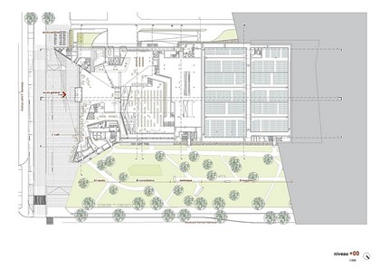 L’aménagement paysager du parvis d’entrée, réalisé en pierres naturelles, se prolonge de plain-pied dans le foyer de la Bibliothèque.