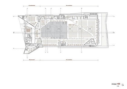 - la zone d’entrée avec son forum ouvert sur deux étages et délimité par l’étage des salles de conférences. Le forum se prolonge vers les espaces de consultation ;
