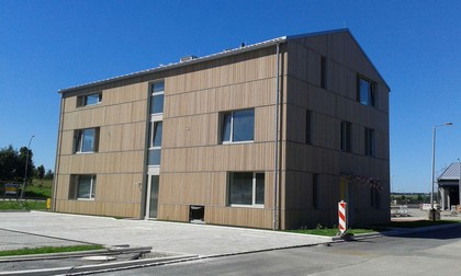 Outre la structure en béton, la façade se compose d’une isolation thermique de 20 cm d’épaisseur devant laquelle se place un bardage en bois vertical comme finition.