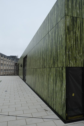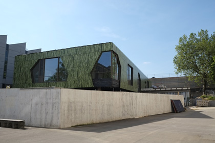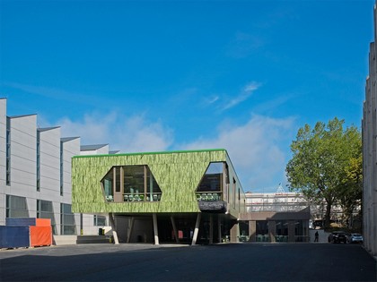 Le hall est pourvu d’une toiture plate à verdure extensive pour des raisons esthétiques, écologiques et surtout énergétiques. Les façades reçoivent un revêtement uniforme et de couleur neutre en panneaux à base de résines thermodurcissables, similaire à celui de la cafétéria, soulignant le volume monolithe en contraste par rapport au volume prononcé du restaurant.