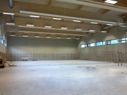 A l’intérieur, un maximum des surfaces sera gardé en béton architectonique en continuité du concept de base. Les vestiaires sont entièrement carrelés avec une étanchéité au sol et aux murs pour les coins de douches. Des puits de lumière garantissent un éclairage naturel dans les couloirs enterrés. Le terrain de sports est équipé d’un plancher sur double lambourde et divisible par des rideaux mobiles jusqu’à trois unités. Des bandes de fenêtre en façade et des coupoles en toiture permettent à réduire l'utilisation d'un éclairage artificiel.