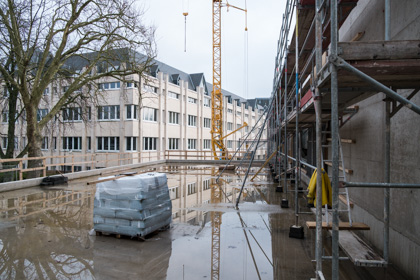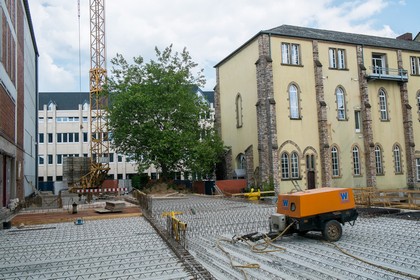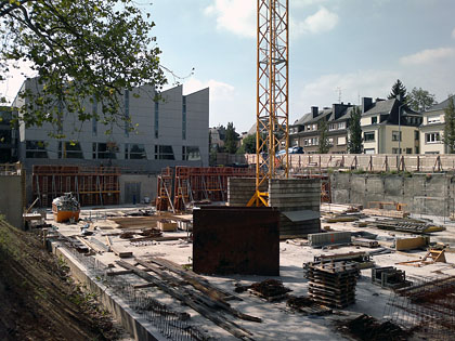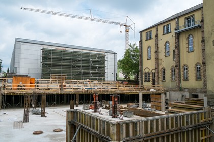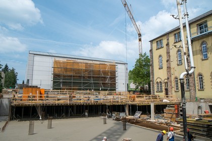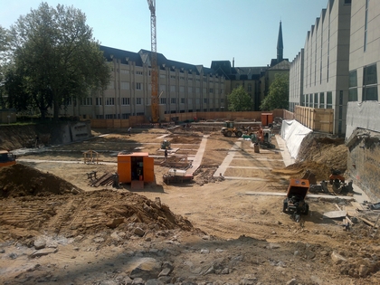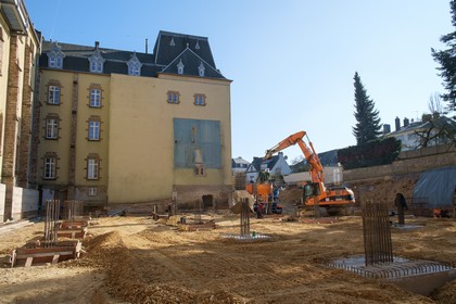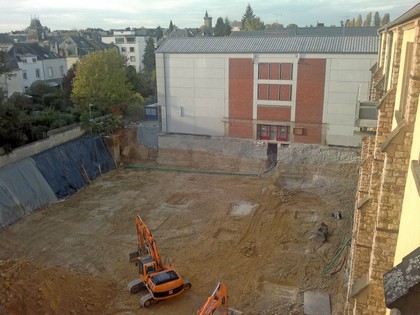 Pour dégager et mettre en valeur l’ancien bâtiment du cloître ainsi que pour répondre au besoin d’une cour de récréation plus grande, l’implantation du restaurant scolaire et du hall des sports est prévue du côté rue Ermesinde. Par ailleurs, l’emplacement actuel du hall des sports et de la cantine ne permet pas d’y reconstruire un nouveau volume de même fonction en raison d’un programme plus étendu.