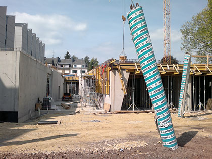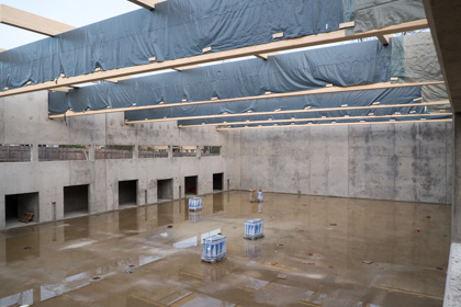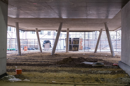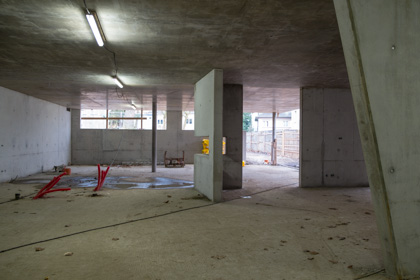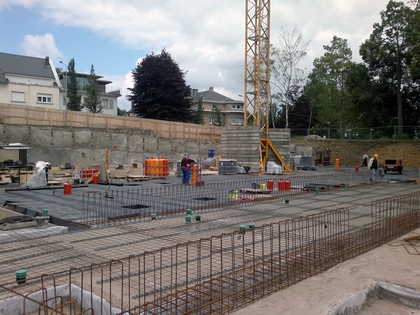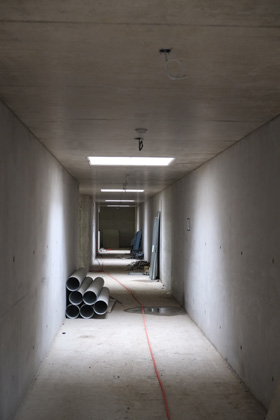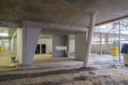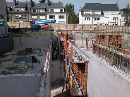 Le volume enterré est réalisé entièrement en béton armé avec des planchers du type « dalle champignon » sans poutres.