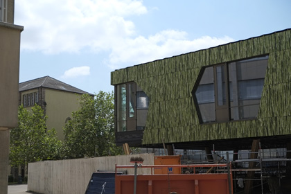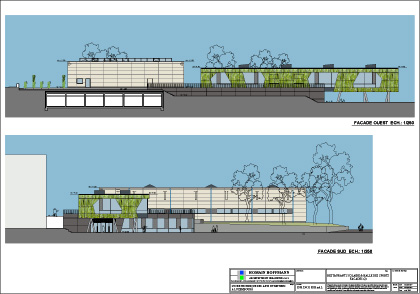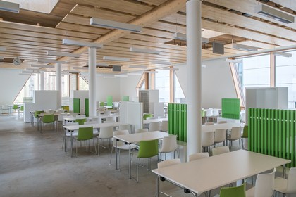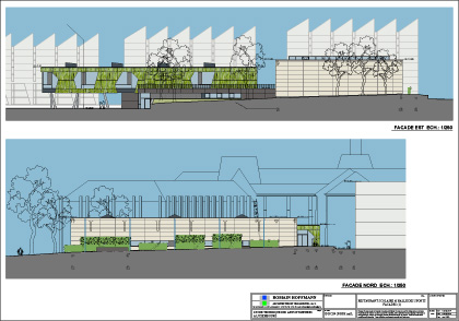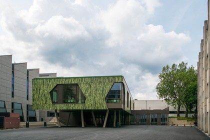 La cafétéria s’oriente vers la cour en prolongeant celle-ci par ses grandes surfaces vitrées. Pour des raisons esthétiques, écologiques et surtout énergétiques, le volume simple du restaurant recevra un toit plat à verdure extensive. Les façades de la cafétéria et du restaurant sont composées de panneaux à base de résines thermodurcissables. Alors que ceux de la cafétéria seront dans une teinte neutre, ceux du restaurant s’inspirent de l’image des arbres et sont imprimés de motifs de verdure tout en marquant la position centrale du restaurant scolaire par rapport aux façades discrètes des bâtiments environnants. Des grandes ouvertures polygonales garantissent la liaison intérieur/extérieur et font découvrir des relations visuelles vers le paysage environnant.
