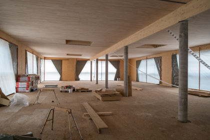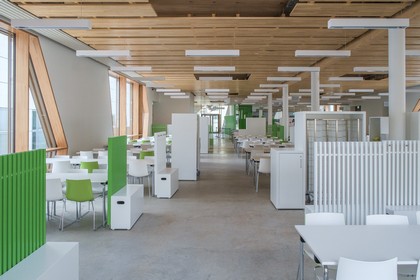Dans les locaux principaux le béton vu constitue le matériau prépondérant qui est combiné à un mobilier en couleur et d'éléments en bois au plafond améliorant l’acoustique et le confort énergétique.