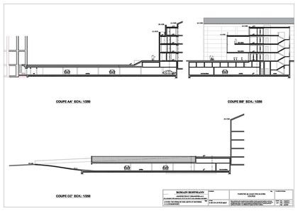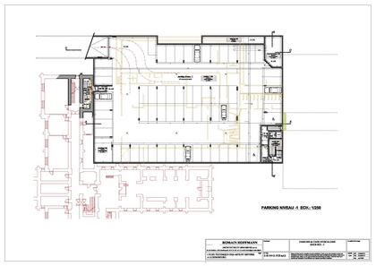 La suppression du logement du concierge libère des surfaces dans le bâtiment existant qui permettent de réaliser une cage d’escalier allant du niveau du parking jusqu’au rez-de-chaussée du bâtiment existant. Le raccord à la cage d’escalier liée au bloc C des ateliers d’un côté et la montée directe dans le bâtiment principal de l’autre côté ainsi que le chemin d'accès aux pompiers du côté ouest définissent les dimensions du parking.