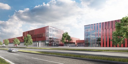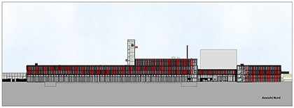 Alors que le complexe de la zone 1 constitue le point de repère architectural du projet, les matériaux sélectionnés pour les façades de la zone 2, notamment du grand hall, sont choisies de manière à rester plus discrets.