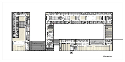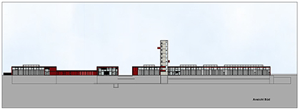 Uniquement la centrale de commandement des secours d’urgence en tant que composante essentielle du centre ainsi que la tour de tuyaux dépassent la construction continue à trois niveaux.