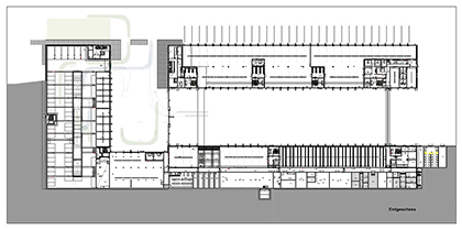 A la jonction entre les parties est respectivement ouest de la cour d’entrée se trouvent des surfaces de synergie étant utilisées en commun par l’institut de formation initiale et continue, les sapeurs-pompiers ainsi que les administrations, à savoir la cantine avec restaurant ainsi que les grandes salles de réunions respectivement salles de cours.